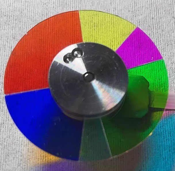 A DLP projector color wheel synchronizes color separation with the DMD chip at high rotational speeds. In the H6500 system, a 6‑segment RYMGCB configuration (Red, Yellow, Magenta, Green, Cyan, Blue) is used to achieve an exceptionally wide color gamut. Unlike wheels with a white segment, this design focuses on color accuracy and saturation by using complementary color segments (yellow, magenta, cyan) to expand the reproducible color space.