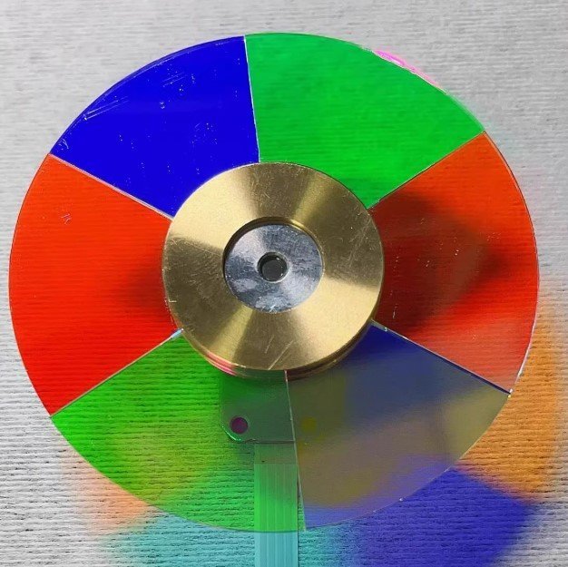 Important Note: Handle the color wheel by its edges only. Do not touch the glass surface or the colored segments. Static electricity or fingerprints can affect balance and color performance. Always use ESD protection.