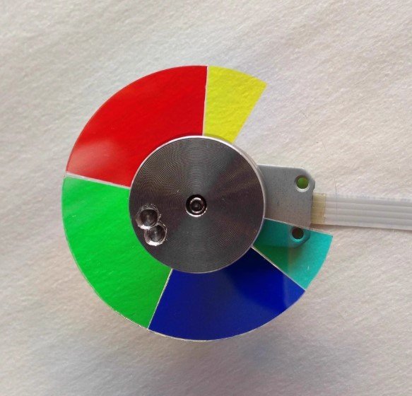 A DLP projector color wheel synchronizes color separation with the DMD chip at high rotational speeds. In the V260+ system, a 6‑segment RGBCWY configuration (Red, Green, Blue, Cyan, White, Yellow) is used to balance brightness and color gamut. The cyan and yellow segments expand color coverage, while the white segment boosts overall lumen output.