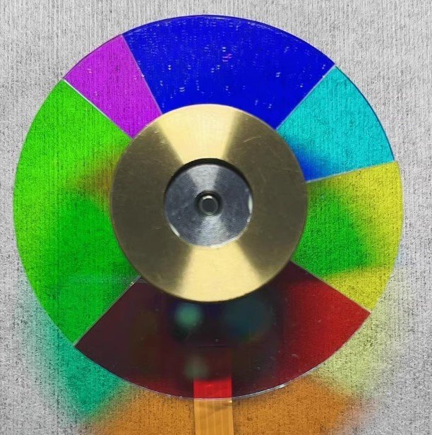 ACER’s DLP timing on the H7350 is specifically calibrated for the RGMBCY color wheel sequence (Red, Green, Magenta, Blue, Cyan, Yellow). This unique arrangement, which includes a magenta segment alongside cyan and yellow, delivers an expanded color gamut with exceptional red‑green‑blue balance and more accurate secondary colors. The 6x rotation speed virtually eliminates the rainbow effect, making this wheel ideal for home theater enthusiasts who are sensitive to color breakup. Using a different wheel (such as RGBRGB or RGBCMY) can cause startup failure, incorrect color decoding, or permanently off‑looking images.