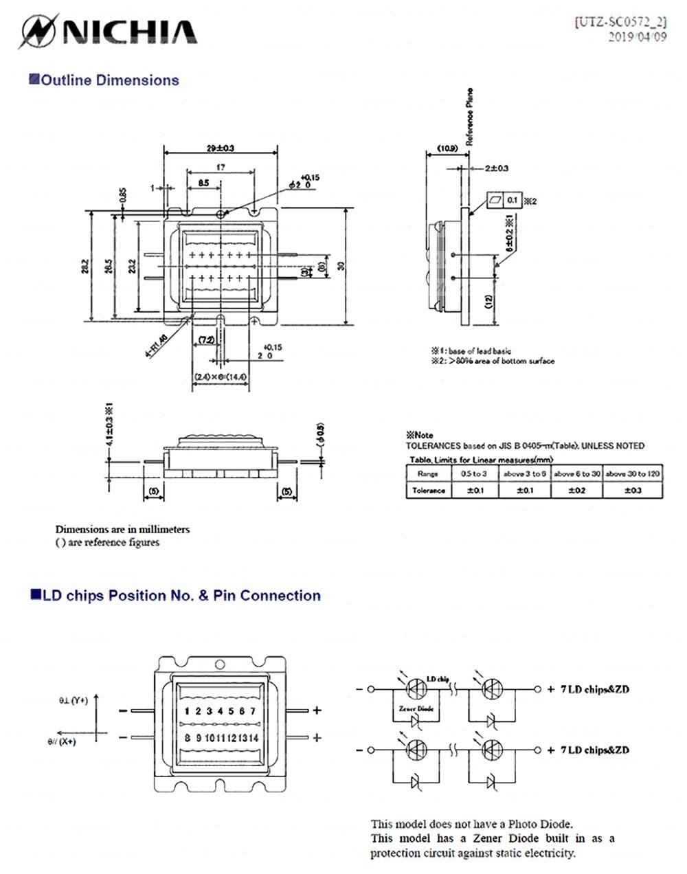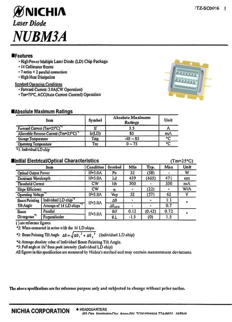 Technical specifications of NICHIA NUBM3A blue laser diode array