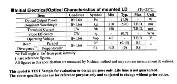 Technical specifications of NICHIA NUGM01 green laser diode