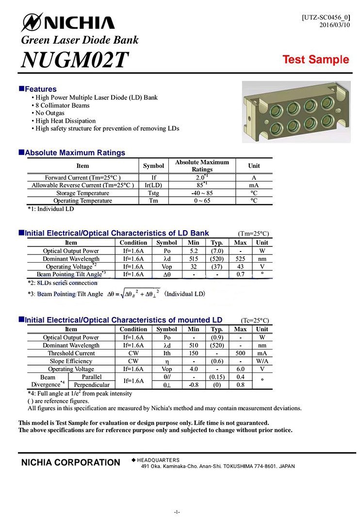 | Product Name and Model | Nichia NUGM02 Green Laser Diode Bank |
