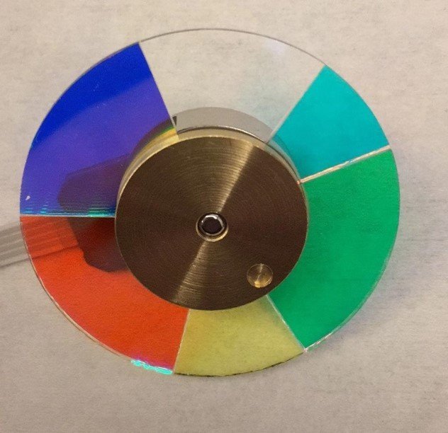 Important Note: Handle the color wheel by its edges only. Do not touch the glass surface or the colored segments. Static electricity or fingerprints can affect balance and color performance. Always use ESD protection.